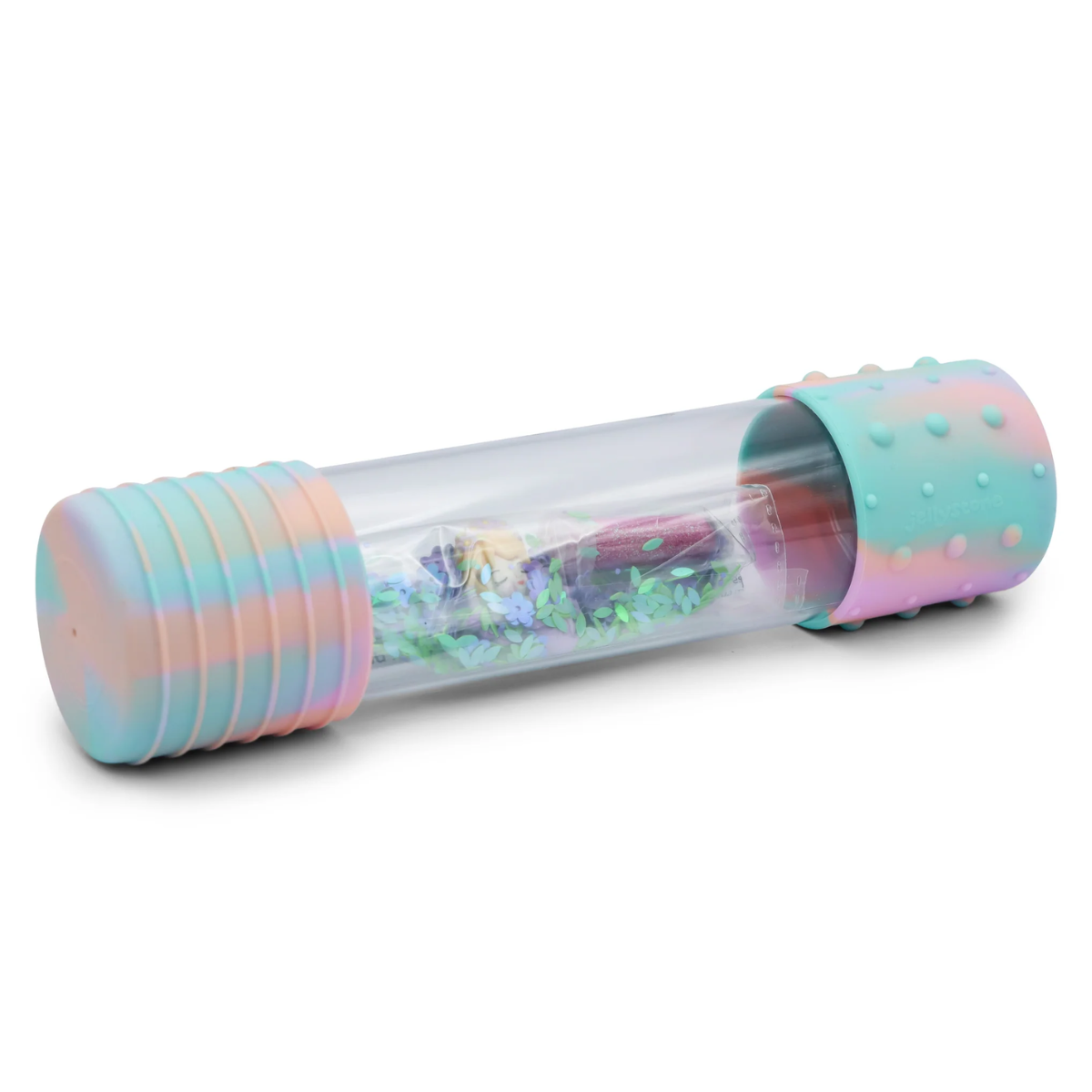 Incluye todo lo necesario para crear tu propia botella sensorial: solo hay que añadir agua tibia y mezclar los accesorios incluidos (confeti, purpurina y pequeños juguetes). Montarla forma parte del juego —tan divertida como usarla— y se recomienda la supervisión de un adulto, especialmente en menores de 3 años.