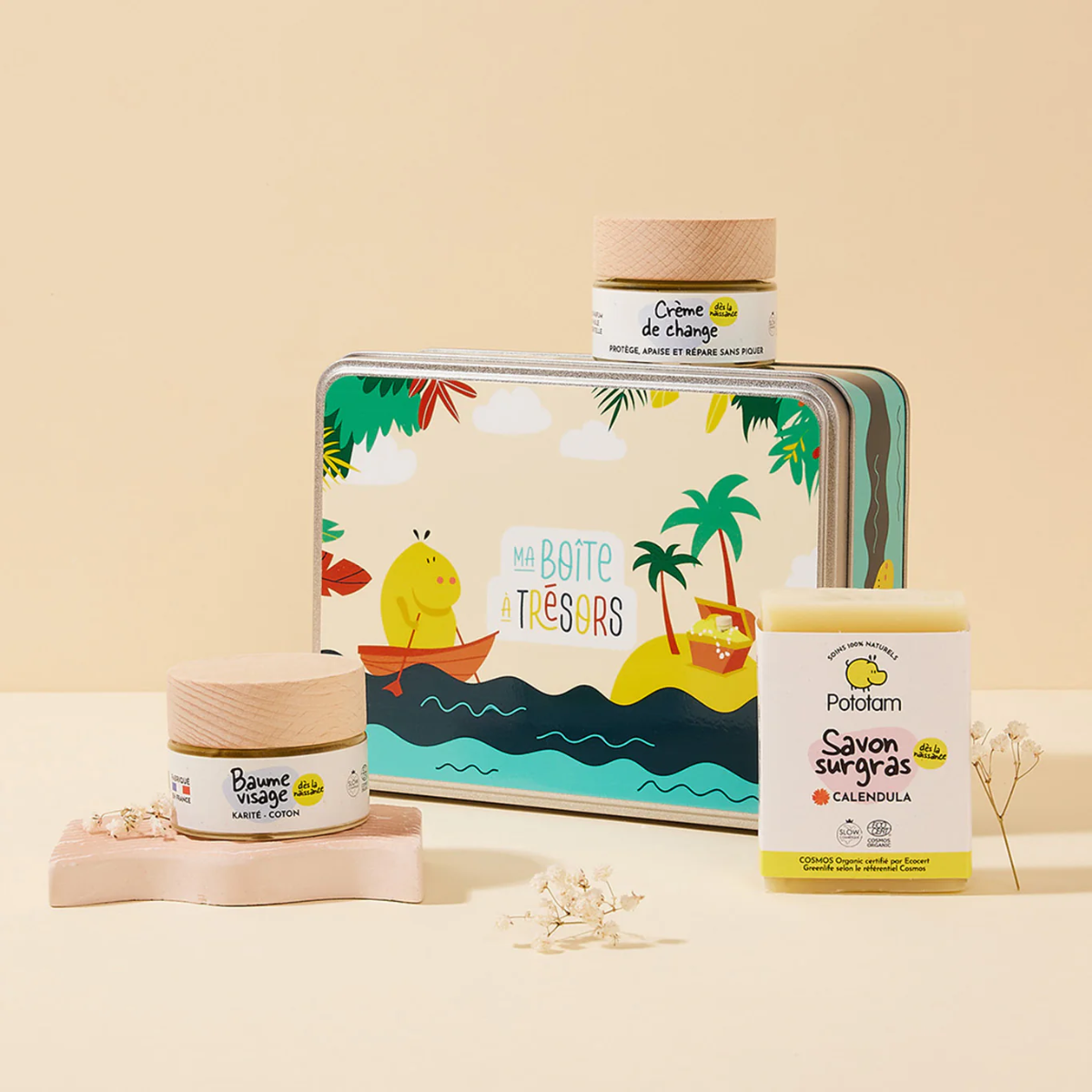 Mima la piel de tu bebé desde el primer día con todo lo que necesita: bálsamo facial, crema restauradora y jabón surgras, formulados con ingredientes 100% naturales y biológicos. Presentados en una lata sostenible, combinan pureza, protección y ternura en una rutina diaria suave y respetuosa con la piel y el planeta
