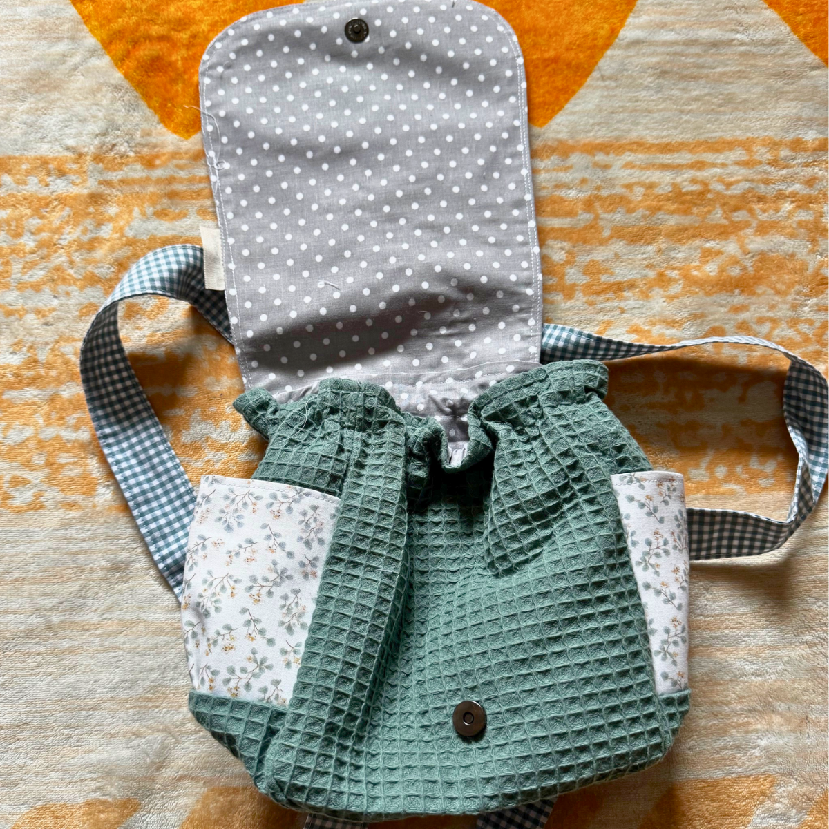 Mochila compacta, hecha a mano, perfecta para la guardería, paseos o la merienda.
