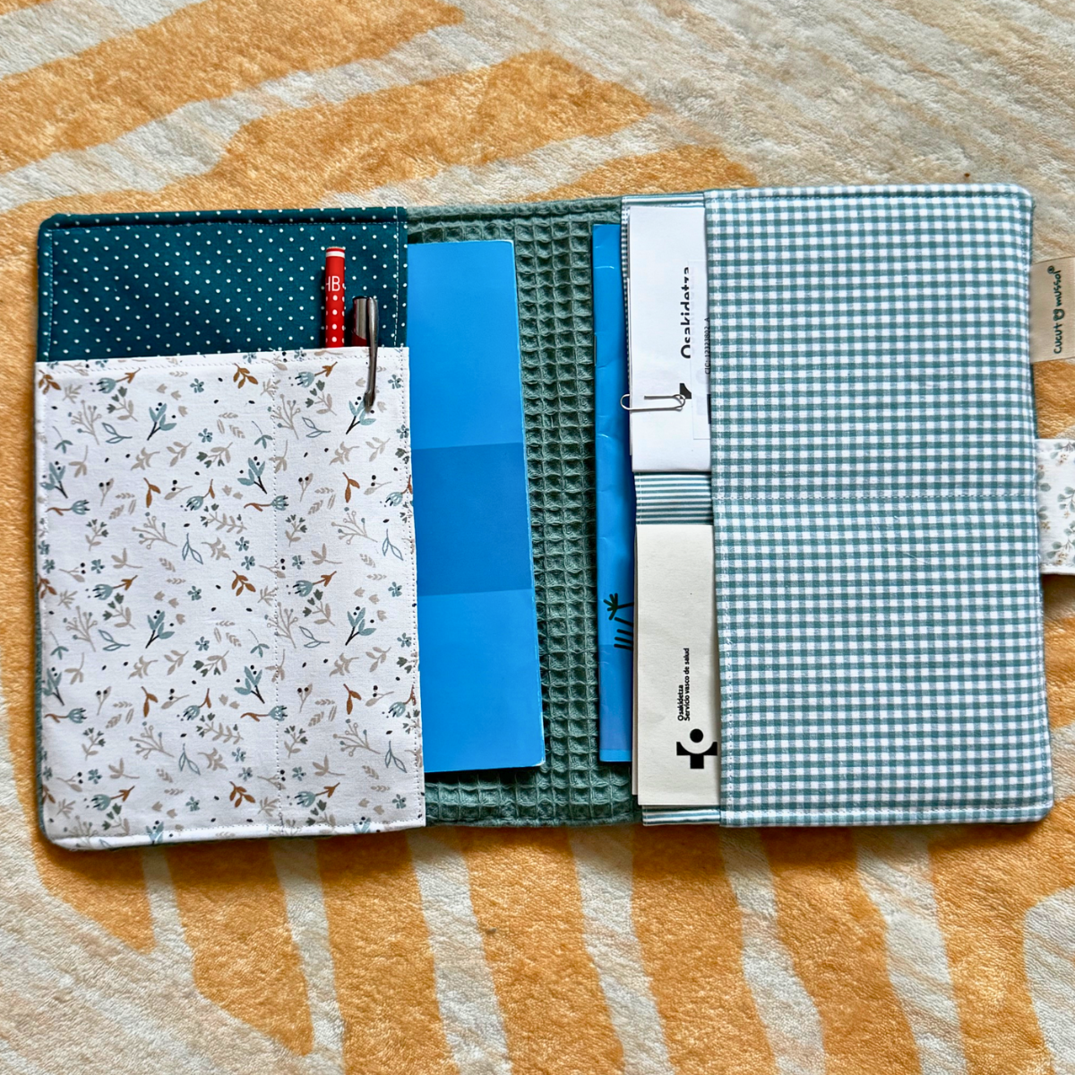 Su diseño es práctico y cómodo: mide 18 x 22 cm cerrado y 18 x 44 cm abierto, ocupa poco espacio y se cierra con velcro para un uso sencillo. En su interior cuenta con 6 bolsillos de distintos tamaños, perfectos para organizar documentos, cartillas y bolígrafo, y tenerlo todo siempre a mano.
