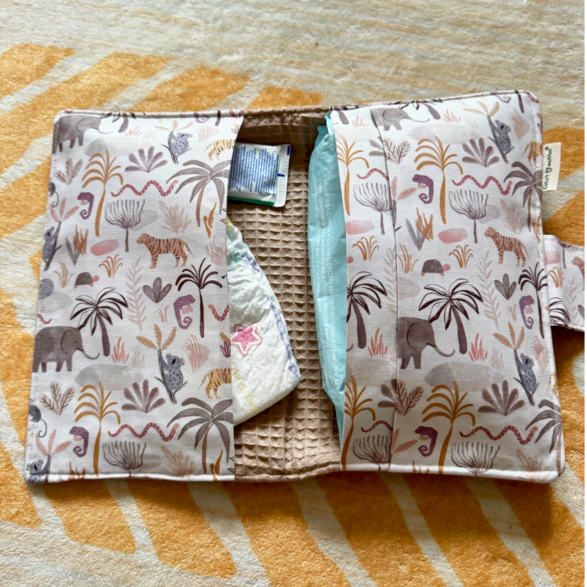 Sencillo y práctico para tener todos organizado en el bolso del carro. Con tres bolsillos interiores para pañales, toallitas y cremas, y cierre de velcro para un uso rápido.