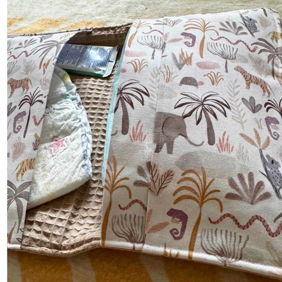 Con unas medidas de 40 x 28 cm abierto y 20 x 28 cm cerrado, ofrece el espacio justo para tenerlo todo a mano sin ocupar de más. En su interior cuenta con tres bolsillos ideales para organizar pañales, toallitas y cremas, manteniendo cada cosa en su sitio.