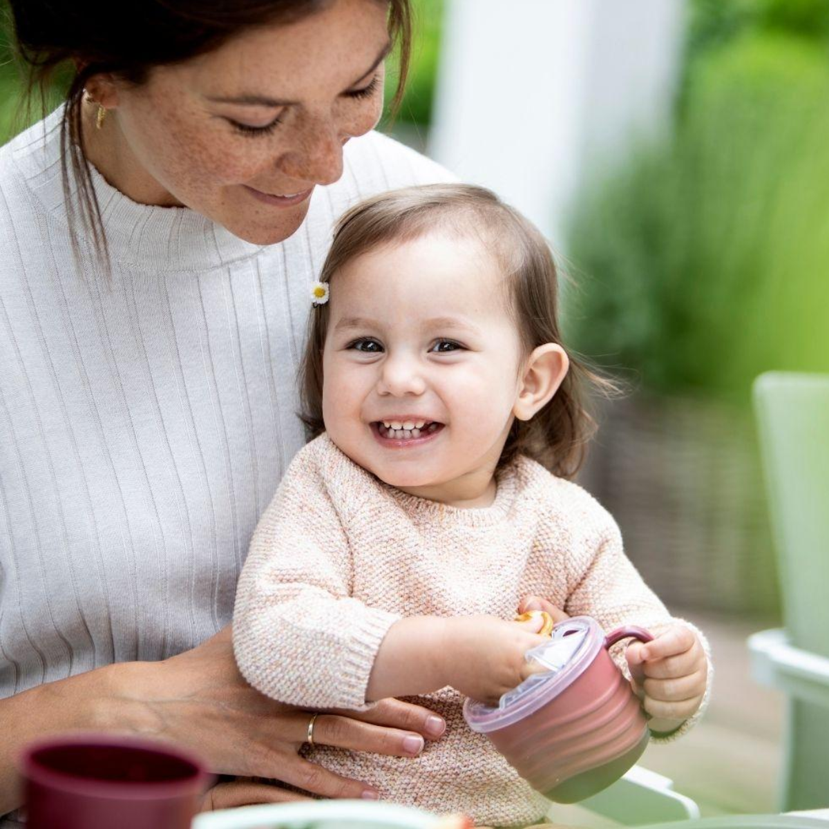 SnackBox práctica y segura para peques desde 9 meses 🌱 Fabricada con más del 90 % de materiales renovables y con inserto de silicona flexible que permite sacar los snacks fácilmente sin derrames. Apta para lavavajillas (excepto el inserto) y reutilizable más adelante como taza. Sin BPA, PVC ni melamina.